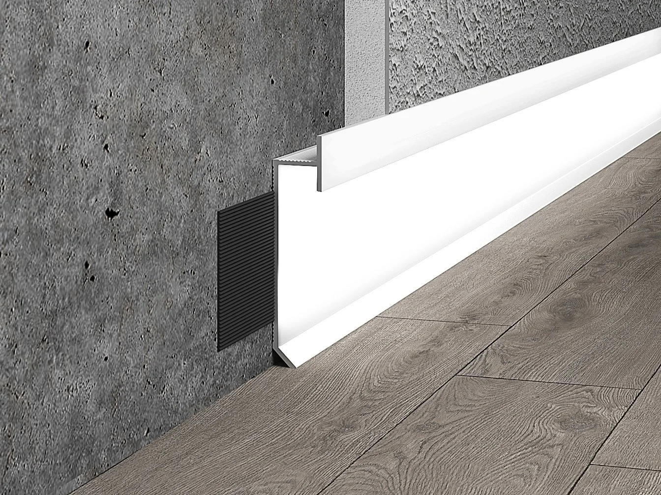 Concealed shadow gap plinth under the LED strip with designer polymer coating, 50mm height. The length of the bar is 2500 mm. In addition to the main functions - it hides the joint between the wall and the floor, does not take up extra space, allows you to place furniture close to the wall, the shadow gap LED plinth is also an additional source of lighting. It is also used as a moulding for decorating and illuminating walls and wall panels.